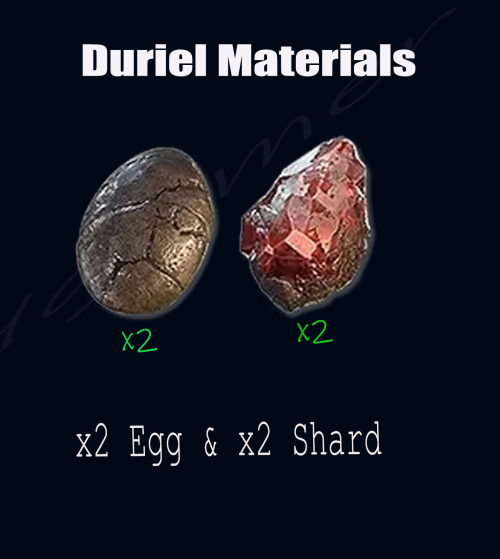 1 Duriel set =(2 x Mucus-Slick Egg + 2 x Shard of Agony) Material Package for Summon BOSS Duriel. eg : 5 duriel boss mats =10 Egg + 10 shard of Agony